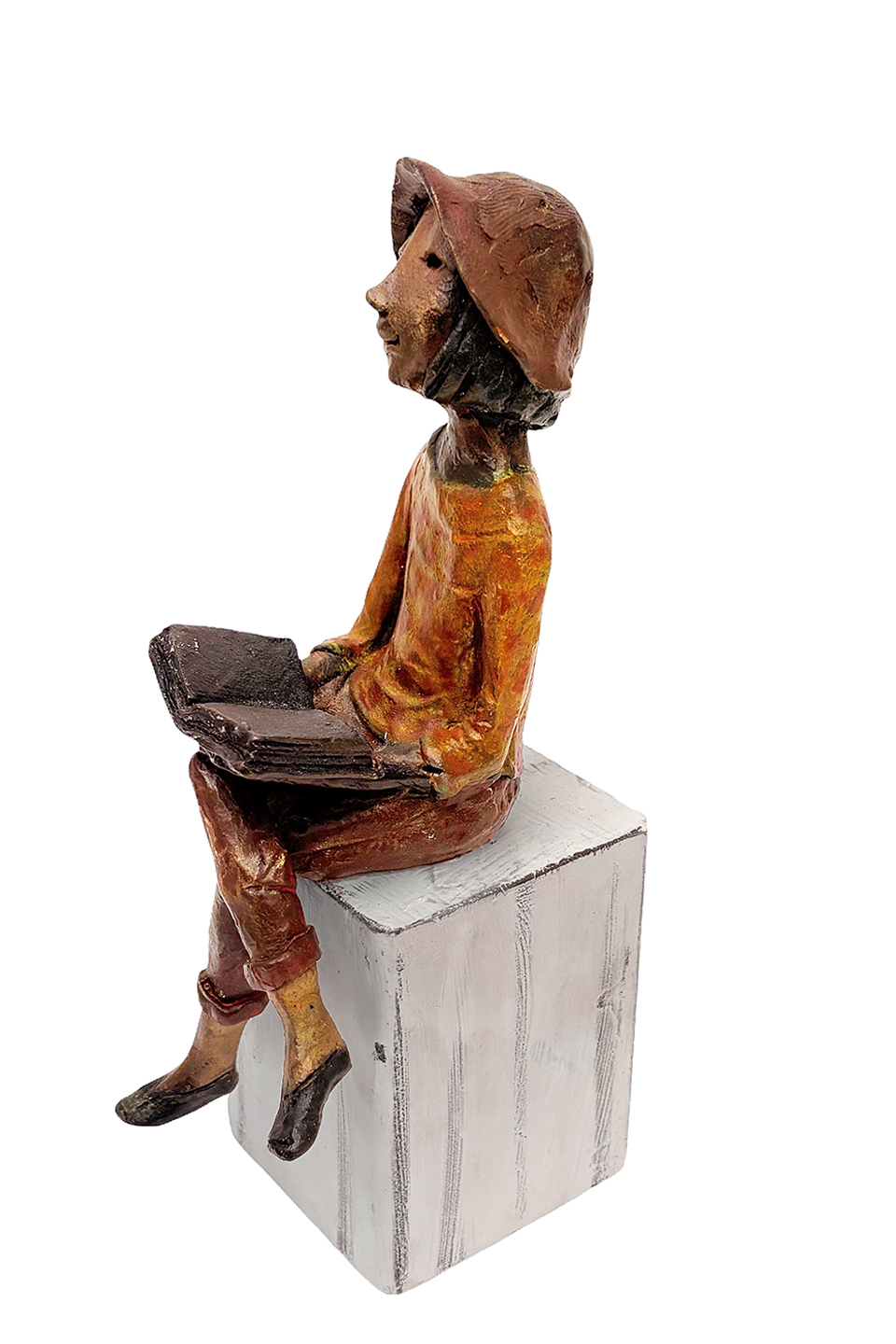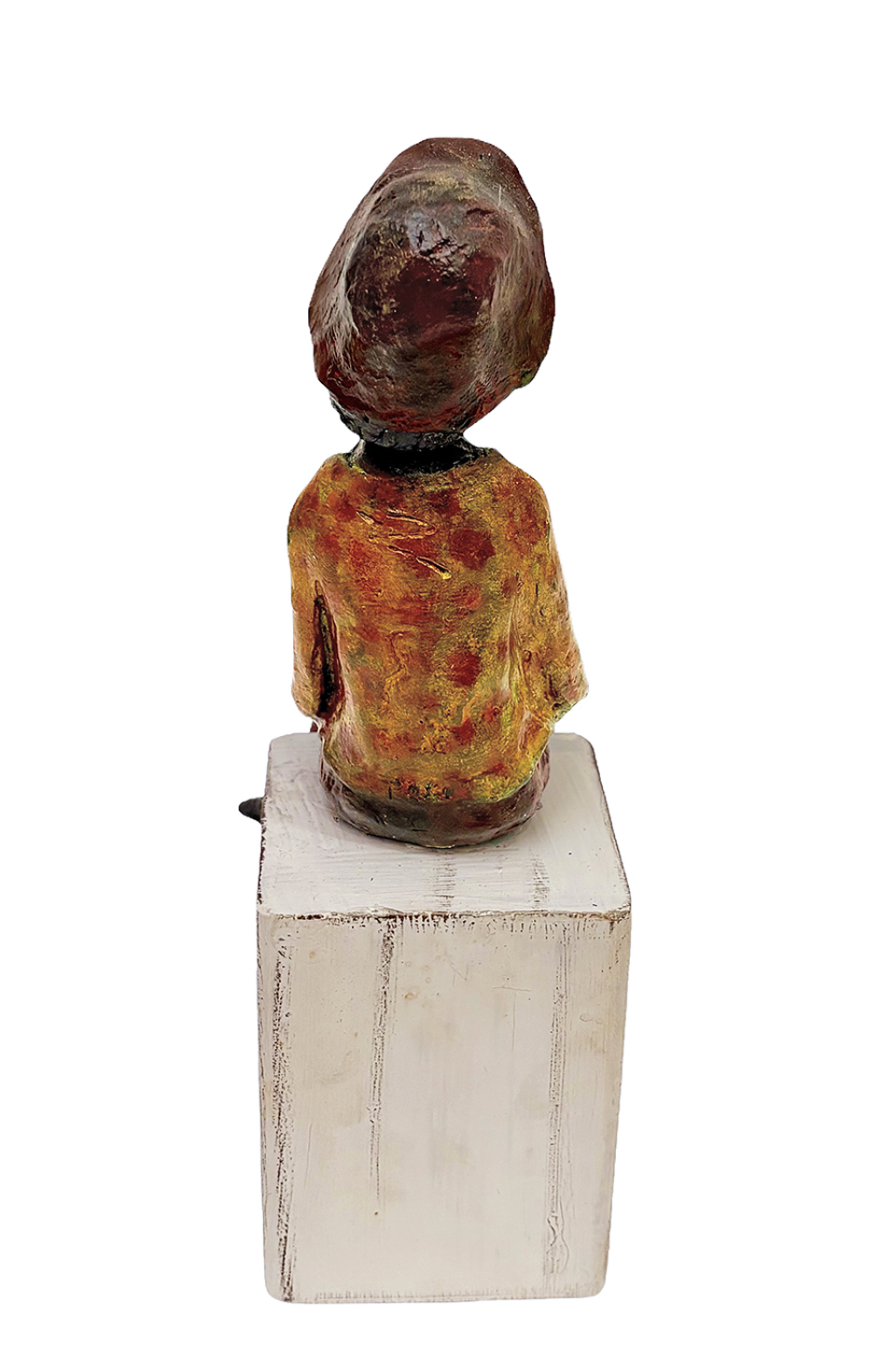 Escultura de bronce de 22 cm de alto, 8 cm de ancho y 11 cm de fondo. Esta escultura lleva un apoyo de hierro, que permite colgarse a la pared.